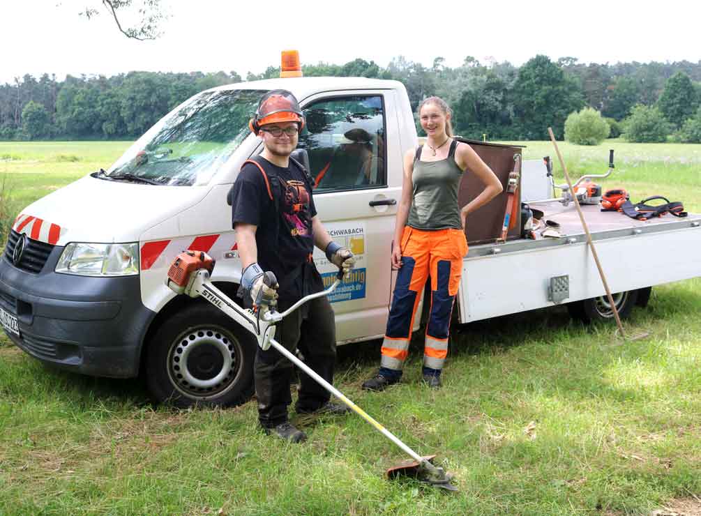 Jeweils knapp ein Jahr lang haben Lara Hauer und Fabian Rauls als Bundesfreiwilligendienstler (kurz: Bufdis) beim Umweltschutzamt der Stadt Schwabach gearbeitet. Zu ihren Aufgaben gehörten vor allem Pflegemaßnahmen an Biotopen in der freien Natur. Daneben standen aber auch die Mithilfe beim Schwabacher Regionalmarkt, Kontrollfahrten entlang des „Schwabacher Naturspaziergangs“ und viele weitere Arbeiten für das Umweltschutzamt an. „Am Anfang hatte ich ein bisschen Sorge, dass die Arbeit mit der Zeit eintönig werden könnte“, so Fabian Rauls am Ende seiner Dienstzeit. „Aber das war überhaupt nicht der Fall. Am interessantesten fand ich die Artenhilfsmaßnahmen für seltene Pflanzenarten.“ Lara Hauer ergänzt: „Mit Geräten wie der Motorsense und der Kettensäge zu arbeiten, war eine ganz neue Erfahrung. Aber natürlich kriegt man vorher eine ausführliche Einweisung und alles wird genau erklärt. Ich habe mich schon immer für Pflanzen interessiert und im letzten Jahr ganz viel Neues gezeigt bekommen.“