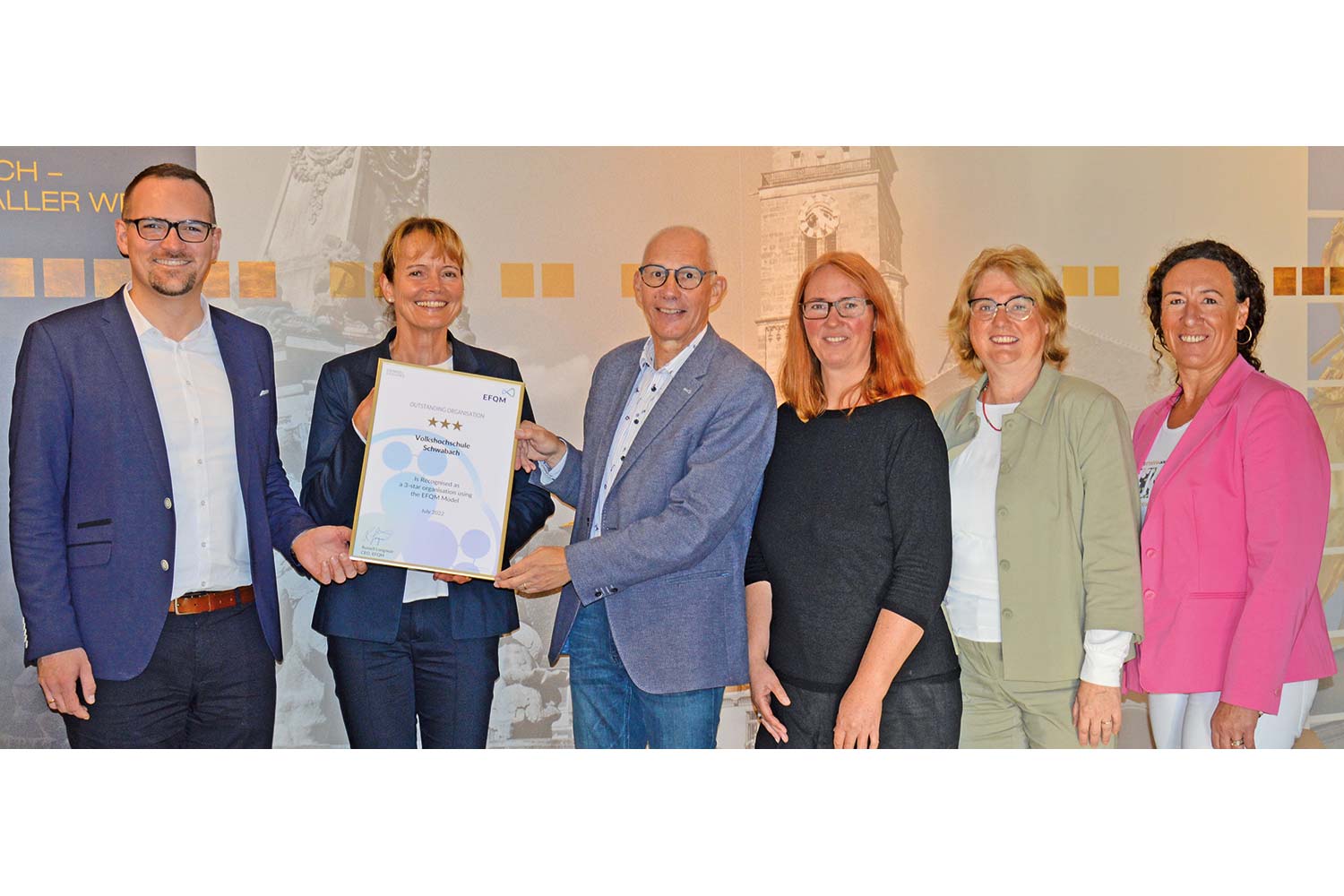 Die Volkshochschule Schwabach (vhs) ist als erste „Volkshochschule bis 5 Mitarbeitende“ von der European Foundation for Quality Management (EFQM) mit dem Zertifikat »Recognized by EFQM 3 Stars« ausgezeichnet worden.